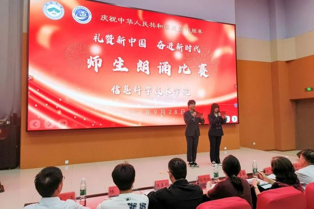 王敦琴对选手们的表现进行了点评,并以“逐梦前行铭初心,不负年华不负卿”为题寄语青年员工,希望同学们坚定理想信念,坚守爱国情怀,以奋斗擦亮青春底色,以实际行动书写爱国奋斗的青春篇章。本次朗诵比赛,增强了师生们的民族自豪感和文化自信,展现了信科师生的爱国情怀和团结向上的精神风貌。活动最后,与会师生齐声合唱《歌唱祖国》为整场活动画上了圆满的句号。