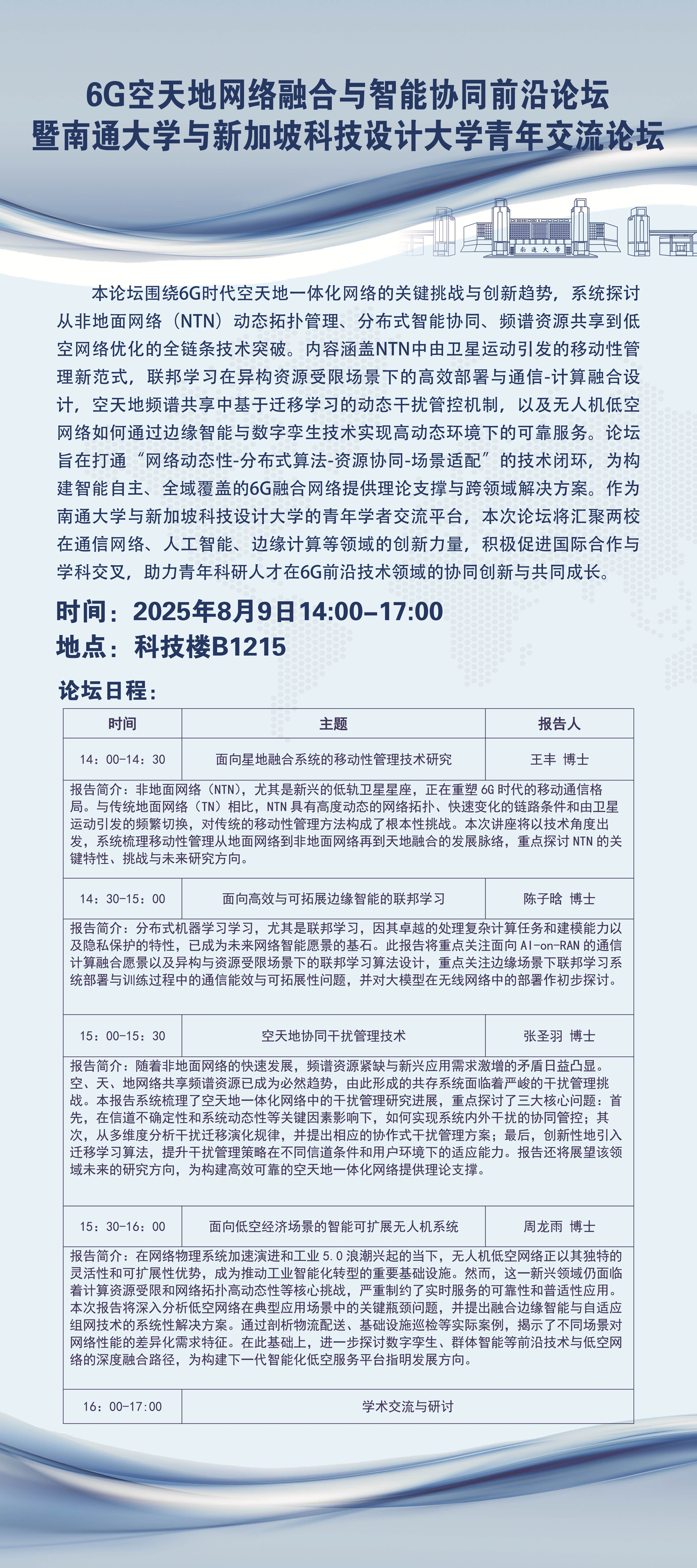 活动预告:6G空天地网络融合与智能协同前沿论坛暨williamhill与新加坡科技设计大学青年交流论坛